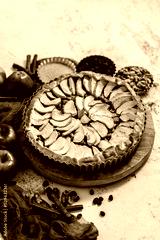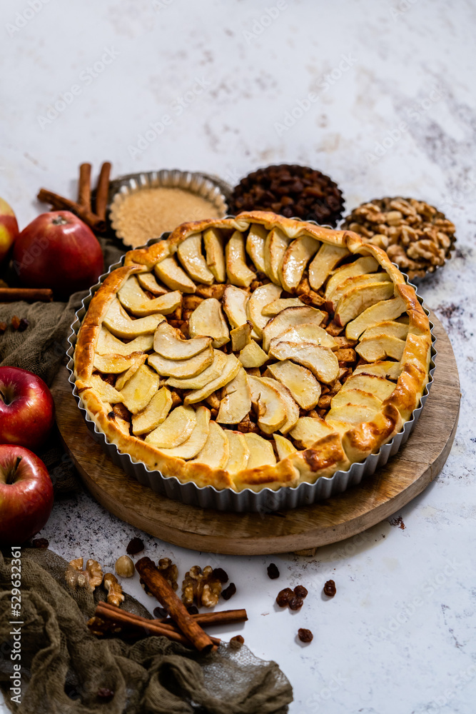 Homemade delicious apple cake with raisins and cinnamon over stone background, top view
