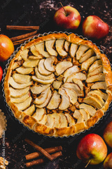 Homemade delicious apple cake with raisins and cinnamon over rusty dark background, top view