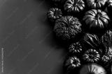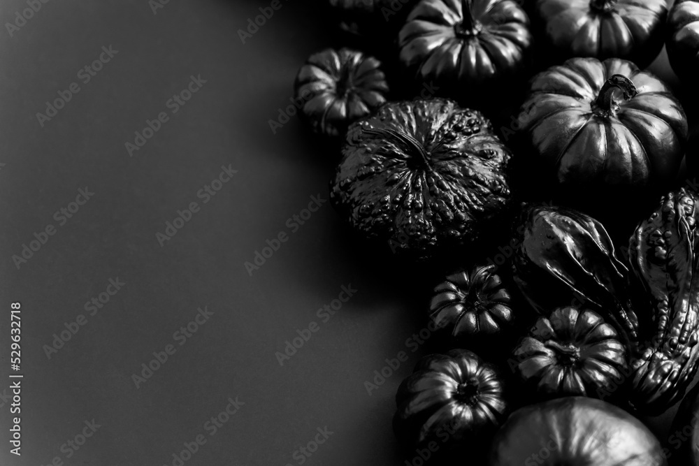 Various kinds cute mini pumpkins in black colour placed black background with copy space