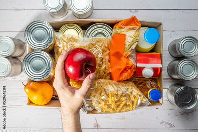 Help Collection Center, Free Food Distribution. Volunteering, food donation box grocery set for in-need people