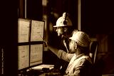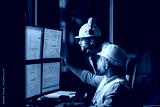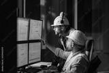 Group of operators control process on product line uses industry 4.0 and digital technology on modern factory. Two engineers follow assembly process uses SCADA system which AI technology and UI