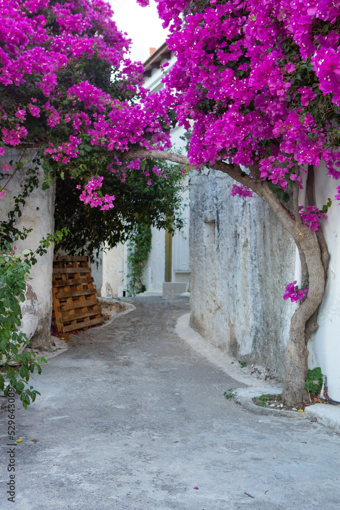 Narrow and colorful street in the village of Kritsa in the island of Crete. White street, beautiful traditional housing in Greece.
