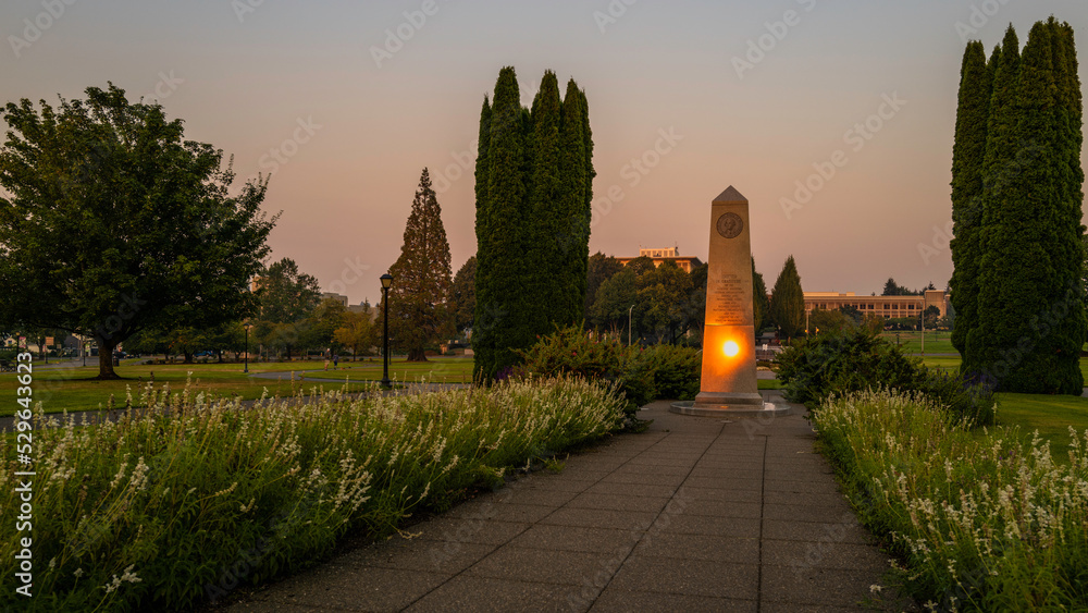 The tranquil garden landscape of the Washington State Capitol in Olympia at sunset with the sun reflected on the monument