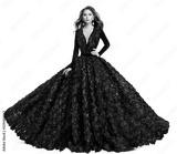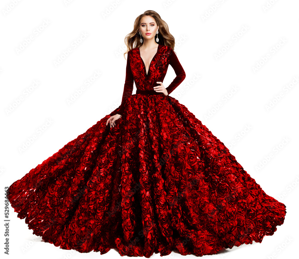 Fashion Model in Red Evening Dress. Beautiful Woman in Princess Ball Gown and Curly Hairstyle. Elegant Lady in Luxury Wedding Dress with Rose Flower over White Studio Background
