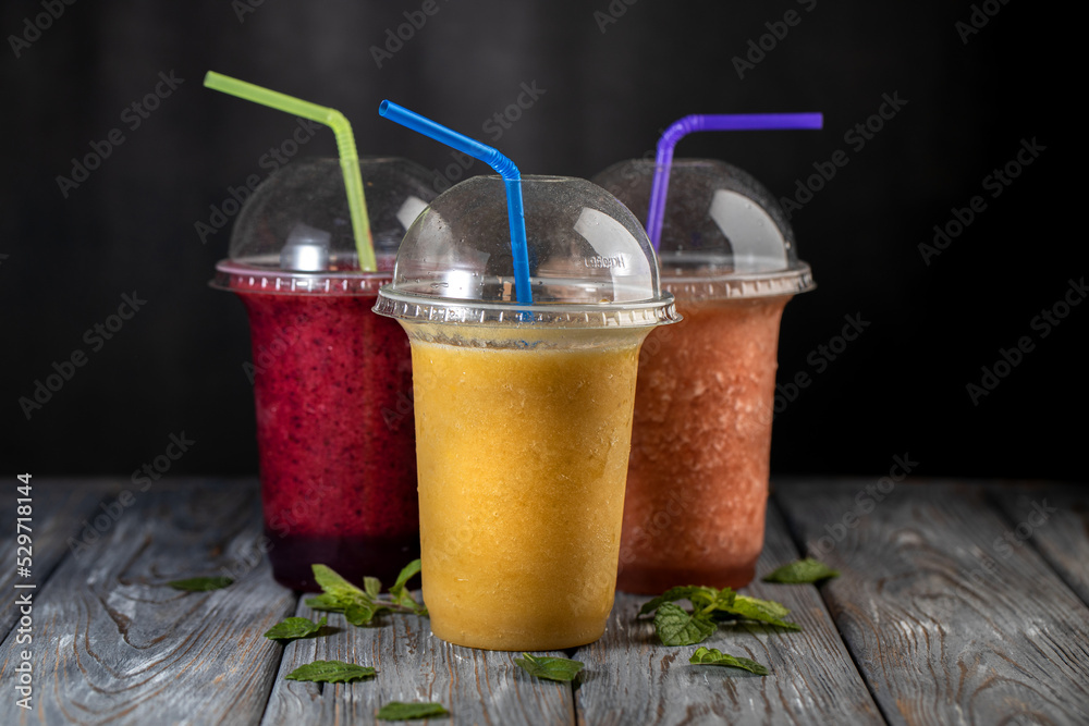 Fresh fruit smoothies on a dark background. Non alcoholic beverages