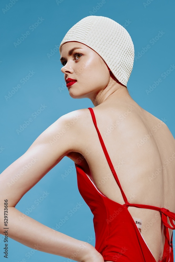 A retro-style swimmer in a red swimsuit holds her hands at the waist on a blue background. Fashion conceptual art of Generation Z