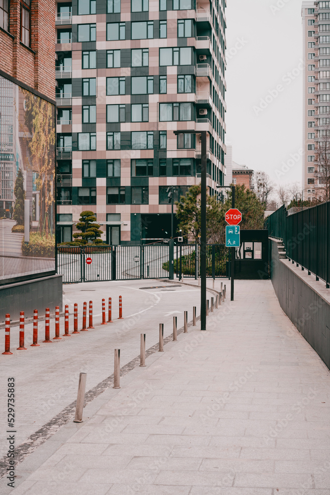 The entrance for cars to the elite residential buildings with barriers on the road. Iron. Day. Direction. Drive. Driver. Driveway. Entry. Protect. Movement. Departure. Property. Station. Stop. Design