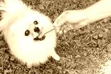 Pomeranian dog chewing a bone on green grass background. Man giving food to pet.