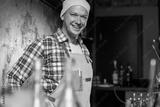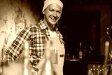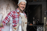 Cafe owner. Pleasant delighted man sitting near the counter, smiling.