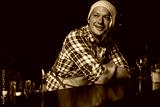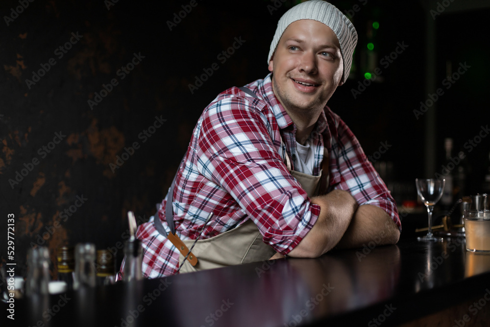 Cafe owner. Pleasant delighted man sitting near the counter, smiling.