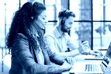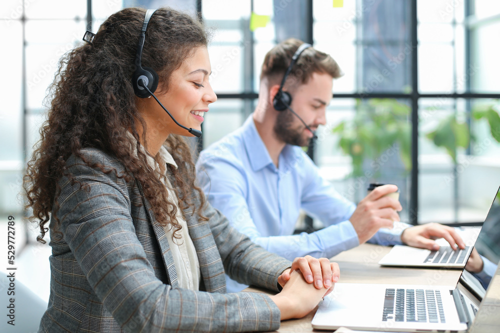 Portrait of call center worker accompanied by her team. Smiling customer support operator at work.