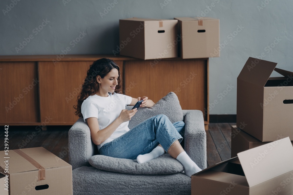 Moving day. Girl using phone app shopping furniture in online store sitting between cardboard boxes