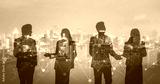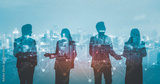 Business global network connection telecommunication technology concept, Futuristic business silhouette people group working on communication cloud technology with internet link graphic background