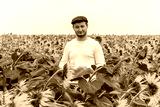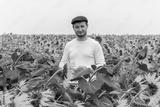 A 35-38-year-old man in a cap stands in the middle of sunflowers . Concept: sunflower harvest, agronomist in the field.