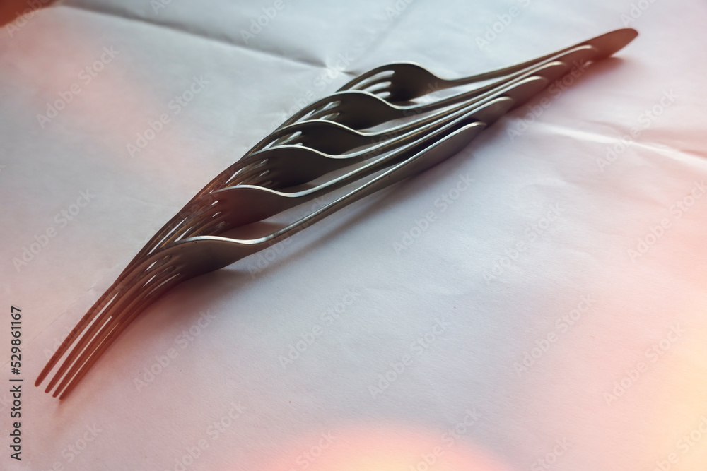 Vintage style photography with six forks arranged on a crumpled white paper tablecloth and burnt film light effect
