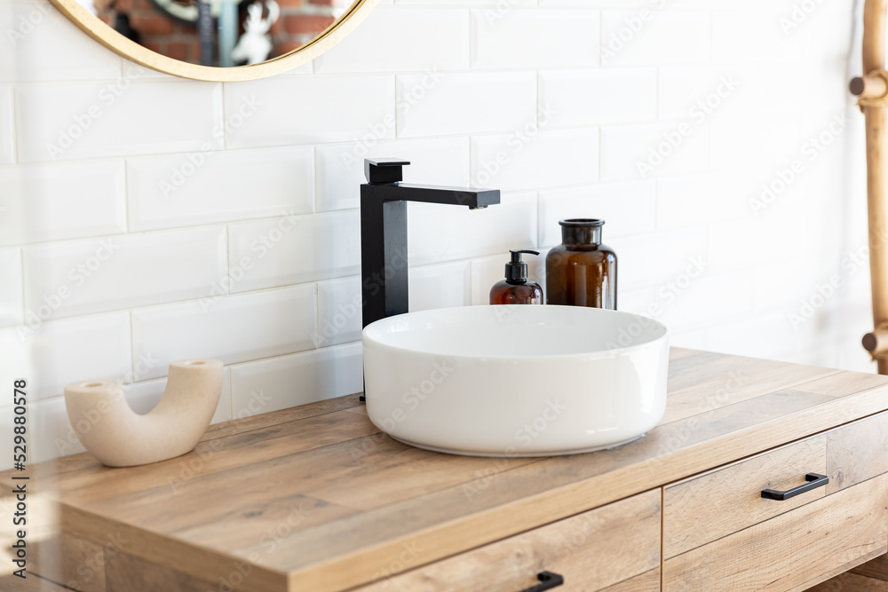 Black faucet for water and white separate high sink on wooden pedestal. Loft style bathroom
