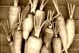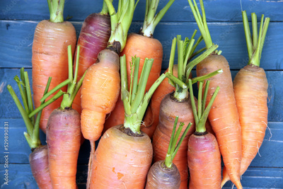 Fresh and sweet carrots on a wooden background