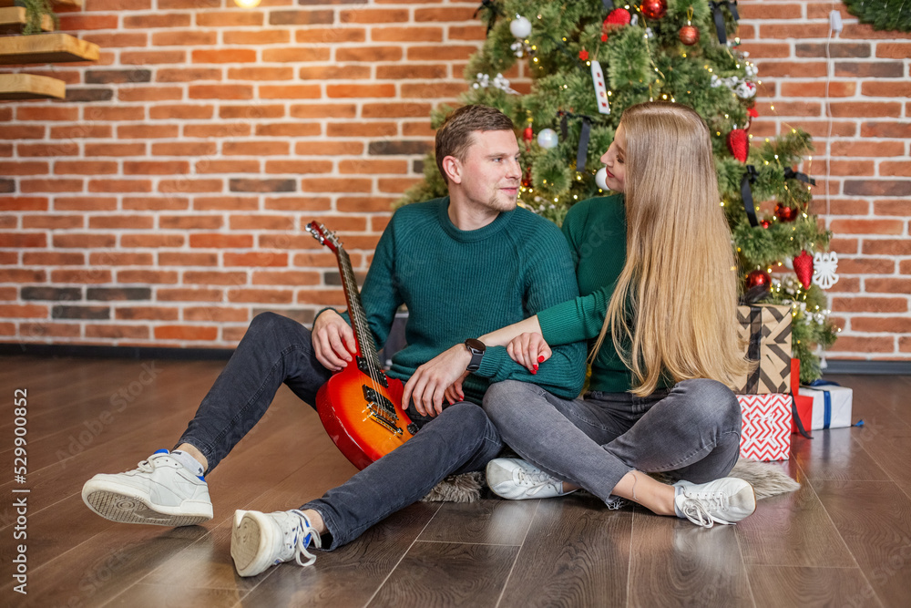 Man and woman celebrating Christmas holiday together. Man playing guitar and singing for woman.