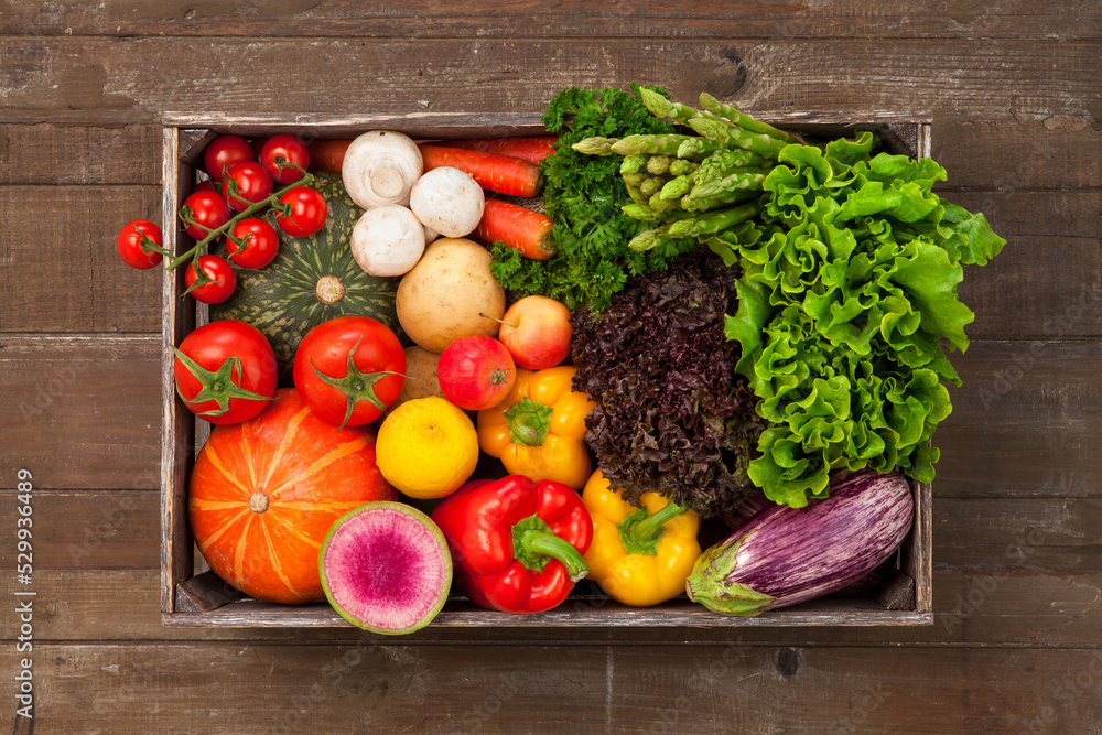 a crate of fresh fruits and vegetables on wooden table. flat lay.