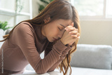 Believe faith charity, calm asian young woman show gratitude, folded hands in prayer feel grateful, meditating with her eyes closed, praying to request God for help. Religious, forgiveness concept.