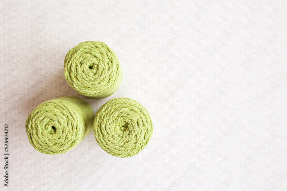 Handmade macrame braiding and cotton threads on textile white background. Green cotton macrame cord and rope. Good image for macrame and handicrafts banners and advertisement. Close up.