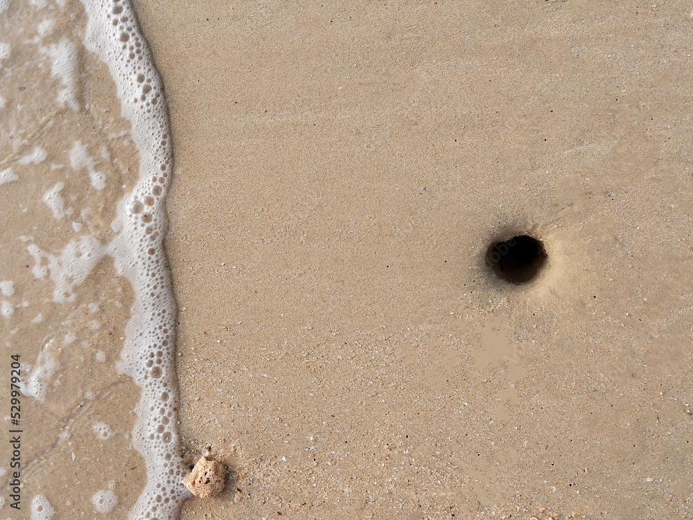 Directly above view of Sea wave rolling to the crab hole on sand beach, nature wallpaper