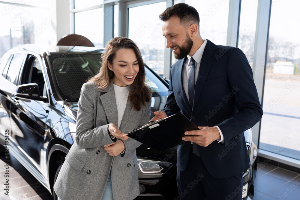 an employee of an insurance company helps to understand the insurance policy of a buyer of a new car