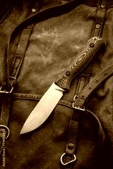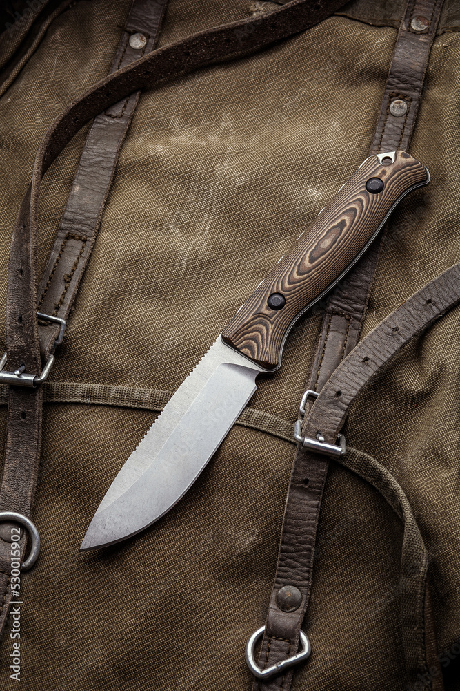 A hunting knife with a wooden handle on a khaki canvas backpack. Weapons for self-defense and survival.