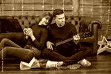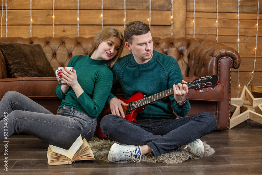 Boyfriend plays acoustic guitar, and girl drinks hot tea near sofa. Concept of romantic date, hobby