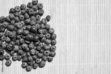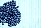 Food background. Ripe blueberries scattered on natural wooden tablecloth. A large plan, top view with negative space