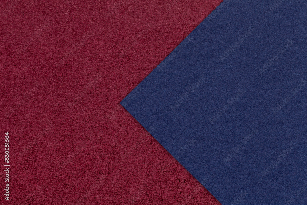 Texture of dark red paper background, half two colors with navy blue arrow, macro. Craft wine cardboard.
