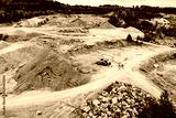 Aerial view of Truck excavator in open sand quarry rubble in Finland.