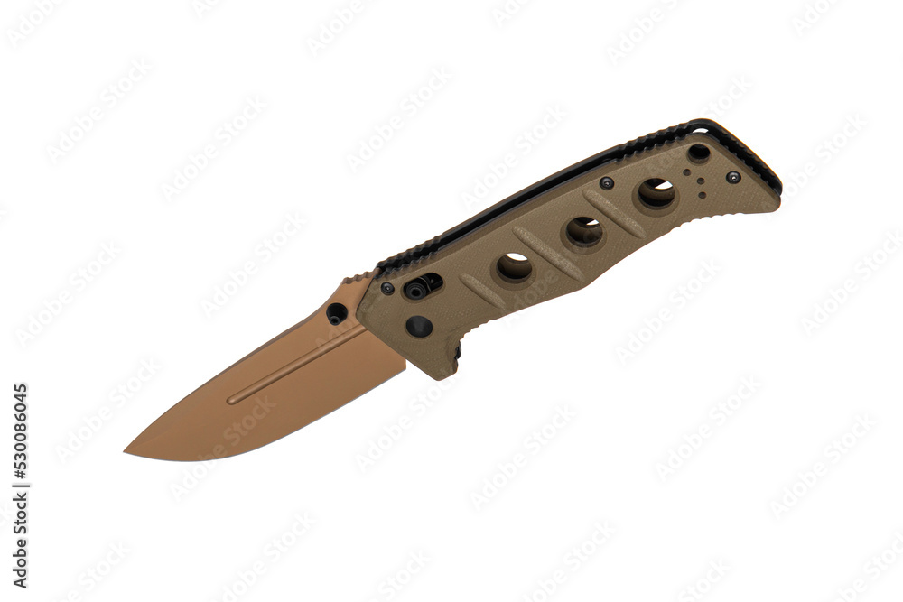 Khaki pocket folding knife. Compact metal sharp tactical knife with a folding blade. Isolate on a white back.