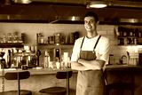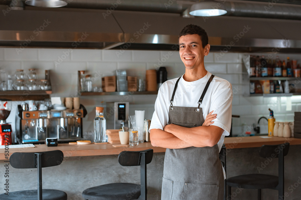 Young man coffee shop owner or barista in face mask and apron working during covid-19 pandemic
