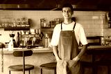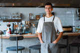 Young happy man coffee shop owner or barista posing with wide smile on face in cafe or coffeehouse