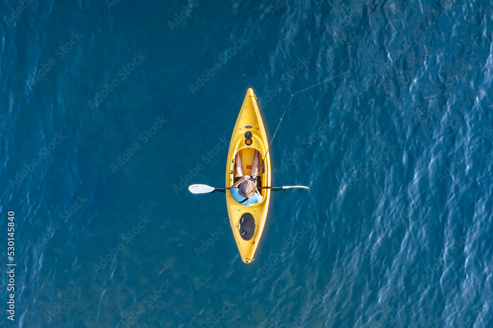 Yellow kayak overhead aerial on a blue water lake with man fishing