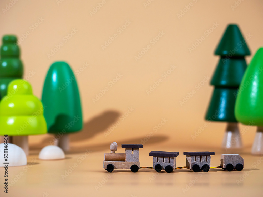 A small wooden locomotive on the background of wooden trees. Travel concept. Eco-friendly wooden toys.