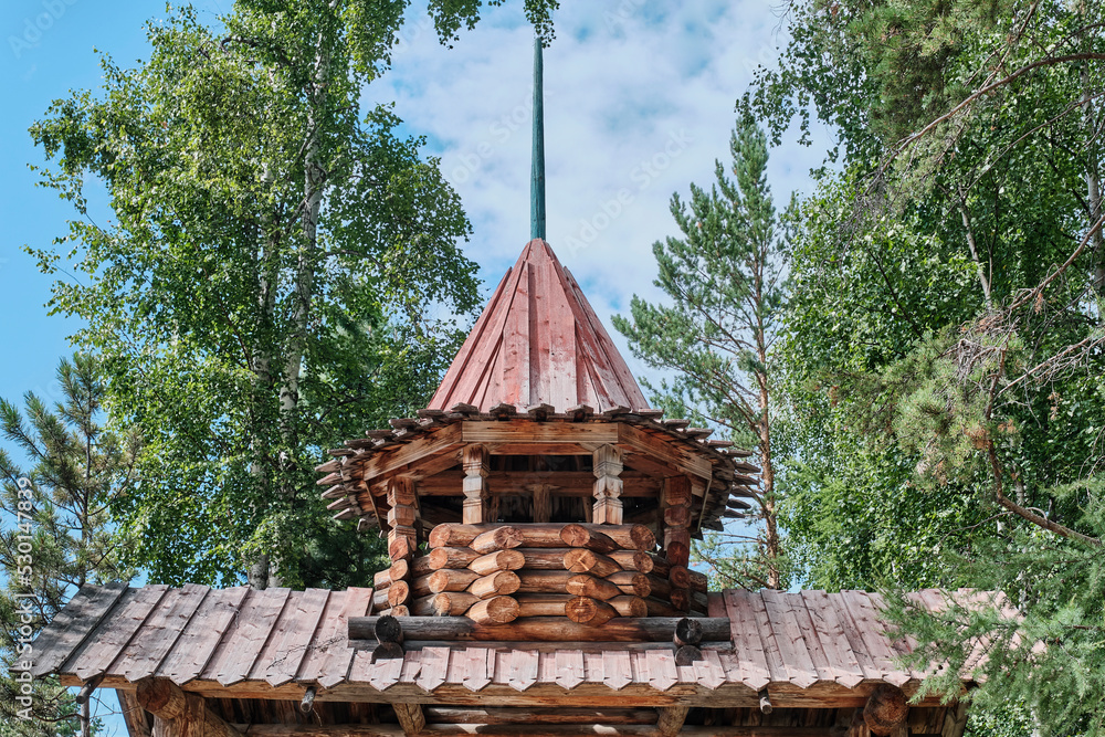 Watchtower in style of Russian wooden architecture on on roof of gate of park-museum