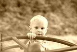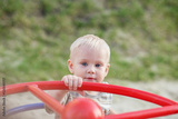 Little boy rides on carousel swing. Toddler plays on playground in summer. Concept of kindergarten