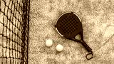 Top view of yellow balls on floor near of padel tennis racket in green court