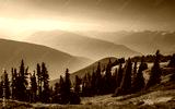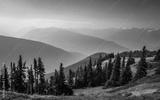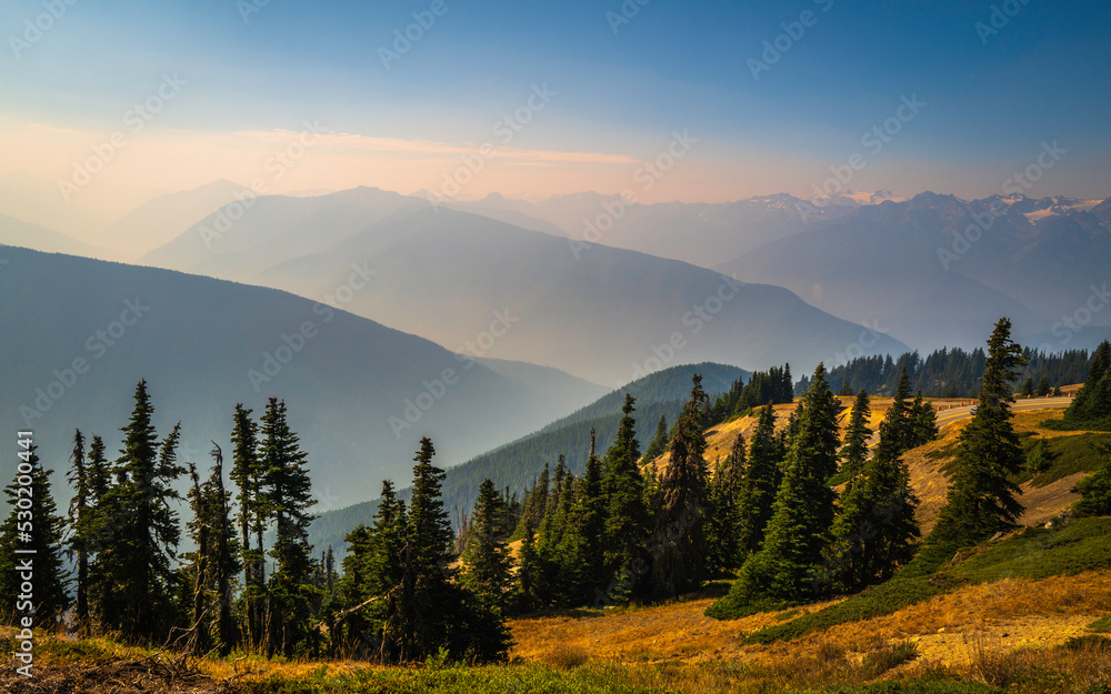 Beautiful mountain top landscape with valleys, spruce trees, and golden hills with wildfire smoke in Olympic National Park, Washington State