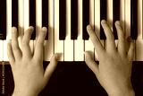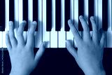 The first basics in music. Fingers of a child on the piano keyboard. Close-up