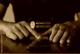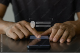 Fingerprint scan for secure access to protected data network with biometrics. Person using finger print authentication technology on mobile smartphone to login on private system.