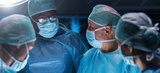 Diverse team of professional medical surgeons perform surgery in the operating room using high-tech equipment. Doctors work to save a patient in a modern hospital. Medicine, technology and healthcare.