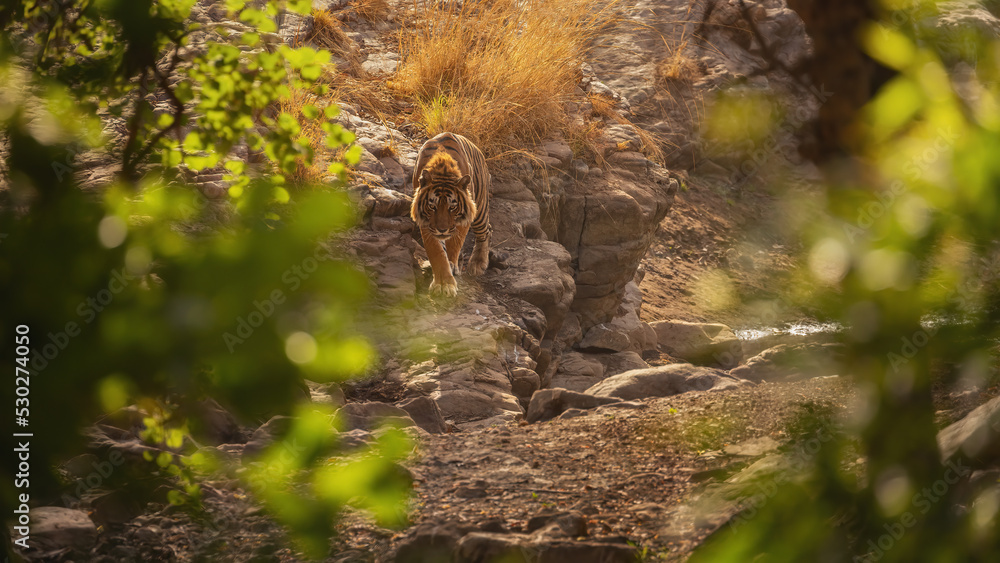Amazing tiger in the nature habitat. Tiger pose during the golden light time. Wildlife scene with danger animal. Hot summer in India. Dry area with beautiful indian tiger. Panthera tigris.