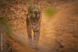 Amazing tiger in the nature habitat. Tiger pose during the golden light time. Wildlife scene with danger animal. Hot summer in India. Dry area with beautiful indian tiger. Panthera tigris.