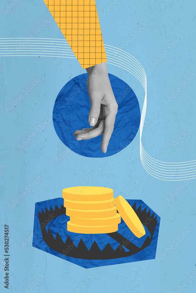 Vertical collage picture of human arm black white effect pile stack coins bear trap isolated on drawing background