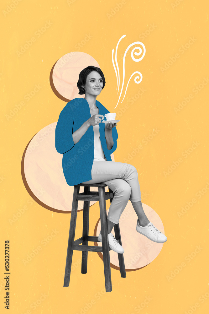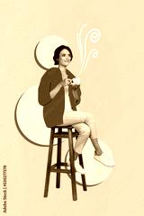 Vertical collage photo of nice lovely gorgeous girl sitting on chair drinking coffee on weekend isolated on beige color background