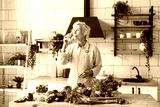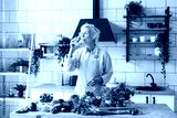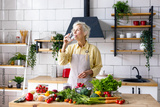 beautiful elderly gray haired senior woman cook in cozy kitchen with fresh organic vegetables on table for healthy vegetable salad, drink pure clear water from glass , healthy food for active life