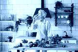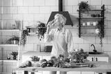 beautiful elderly gray haired senior woman cook in cozy kitchen with fresh organic vegetables on table for healthy vegetable salad, drink pure clear water from glass , healthy food for active life